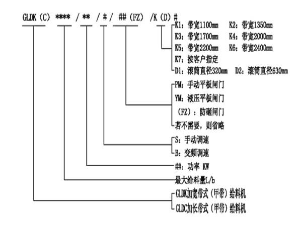 加寬加長(zhǎng)帶式(甲帶)給料機(jī)型號(hào)說明: